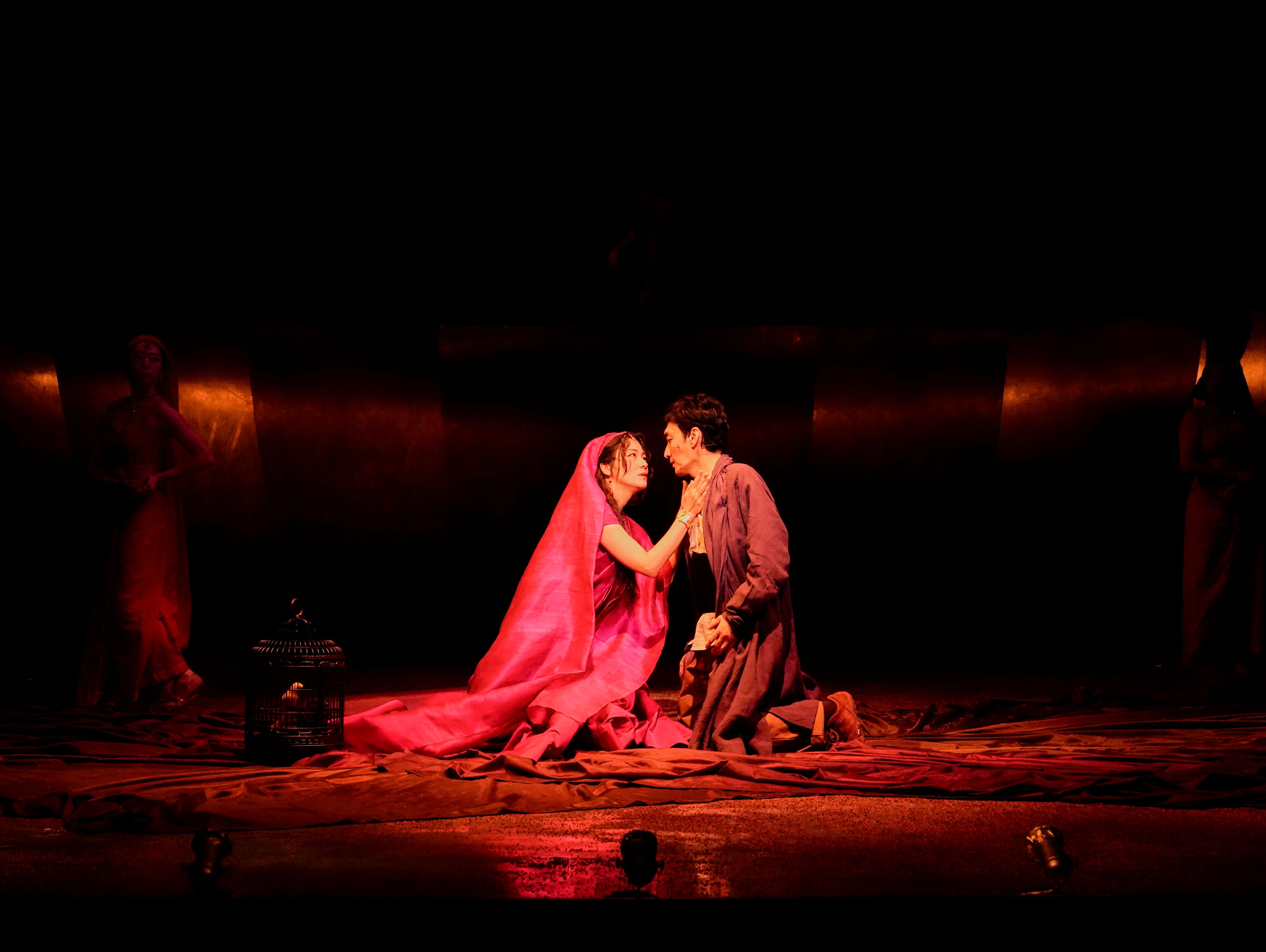 劇作、長田育恵さん、演出、白井晃さん、音楽、三宅純さん、そして原作はヘルマン・ヘッセの傑作小説となり、叙事詩的/哲学的な力強い言葉、時空を超えて古代インドに誘われるような音楽、美術・照明・音響さまざまな要素が有機的につながる劇空間――。一人の男の魂の遍歴を描いた壮大な物語が鮮やかに立ち上がった、最終舞台稽古のレポートをお届けします。古代インドに生まれたシッダールタは、最上位であるバラモン(司祭階級)の子としての生活に疑問を抱き、より深い叡智を求めて家を飛び出す。着いてきたのは彼に魅了されている青年ゴーヴィンダただ一人。しかし二人は袂を分かち、シッダールタは俗世に下野する。やがて高級娼婦カマラー、そして商人カーマスワーミと出会い、贅沢な快楽生活を知る。しかしシッダールタは、それでもなお満たされない心の渇きを覚え……。
