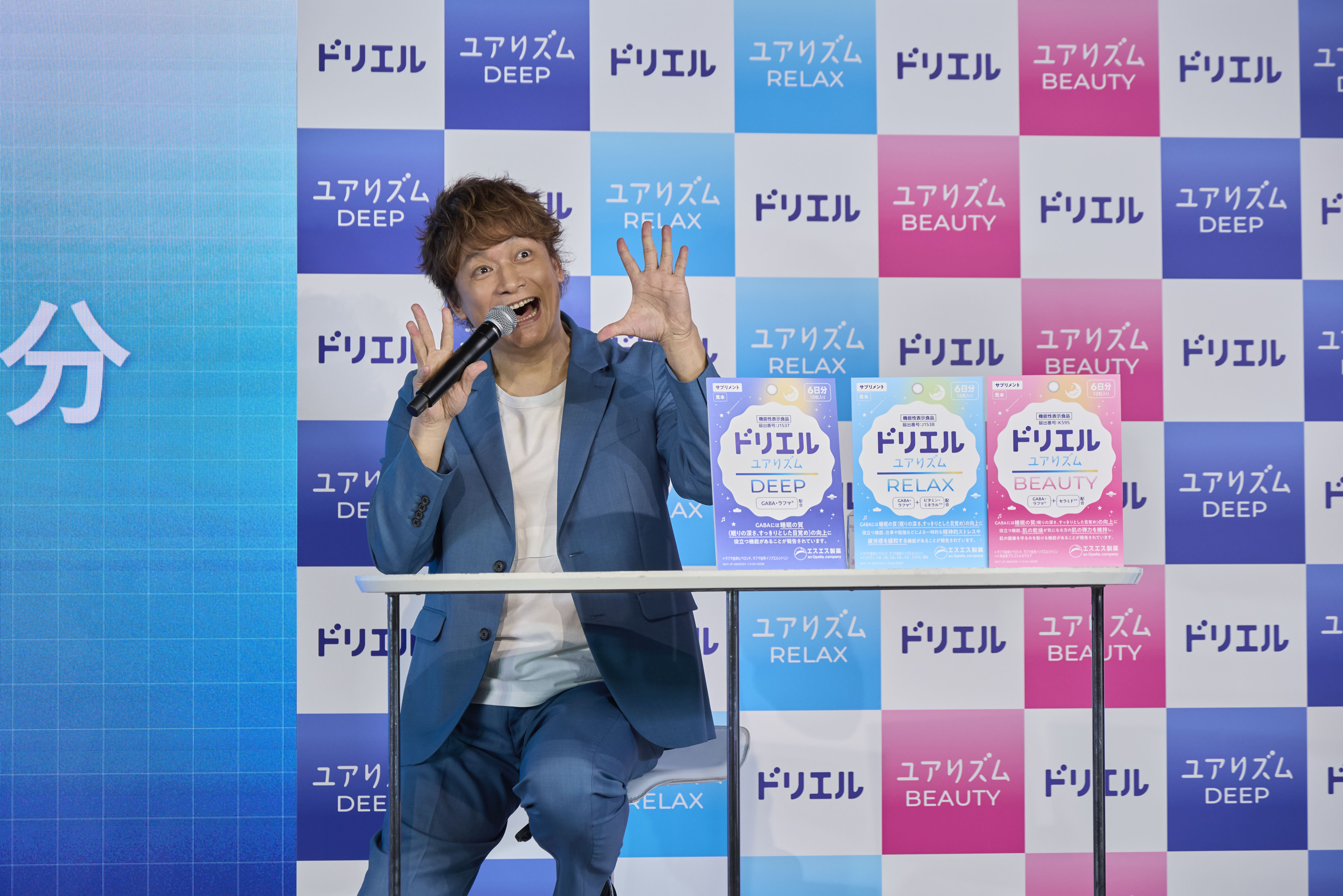 この度、香取慎吾が『ドリエル ユアリズム新CM 発表会 ~目覚めよ、眠りのリズム~』に登壇し、CM撮影エピソードや睡眠タイプについて大いに語りました。本日の発表会は、4月1日(火)より発売され、睡眠の質を高めるとともに、睡眠に関連するさまざまなリズムを整えて充実した毎日に導く睡眠サプリメントシリーズ「ドリエル ユアリズム」の新CMが5月より放映開始されることを記念して開かれました。睡眠時間を考えないといけないと思い始めたという香取は、「いろいろと生活リズムが崩れることもあるけれど気を付けるようにしています。皆さんと一緒です」と正面に座る司会者、取材に集まった皆さんを超え、カメラの向こうの視聴者、読者の皆さんに語り掛けるように終始語りました。本商品、「~目覚めよ、眠りのリズム~」のテーマにちなみ、目覚めさせたい理想の自分とはという質問をされると「笑顔!」と回答。すでに笑顔ではとさらに問われると、「もっとですね!あの時のような笑顔ですね。『おっはー』のテンション、あの感じはこれからいいんじゃないかと思います」と語りさらに笑顔を皆様に届けることを宣言しました。また、会見内では、自身の中に潜む「ふみんモンスター」をチェックすることができ、生まれ持った睡眠タイプと現在の睡眠コンディションを知ることができる「MSTI=MY SLEEP TYPE INDICATOR」※を香取が行った結果も発表されました。香取は「コカトリス」タイプで、まだ日中の時間で活用できる余地がある、と伝えられると、「今まで以上にお芝居をさせていただいたり、ともっともっと元気よく、笑顔で過ごしたいと思います」と今後に向けた意気込みを語りました。